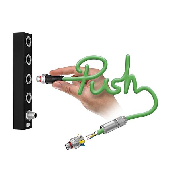 Auch bei beengten Platzverhältnissen und hoher Verkabelungsdichte ermöglicht Push-Pull ein sicheres, werkzeugloses Stecken. Das spart bis zu 80 % Installationszeit im Vergleich zur Schraubverbindung. Individuelle Leitungslängen werden mit konfektionierbaren M12-Steckverbindern realisiert. Und auch hier wird auf das Schrauben verzichtet, denn durch die Push-Lock-Technologie erfolgt der Leiteranschluss bequem und einfach. Starre und vorbehandelte Leiter können direkt in die Klemmkammer gesteckt werden. Zum Anschließen feindrähtiger Litzen oder Leiter mit größerem Querschnitt sowie zum Lösen bereits angeschlossener Leiter, wird die Klemmstelle mit dem Hebel geöffnet. Der Kontakthalter ist farblich und numerisch gekennzeichnet. Dies vereinfacht die Zuordnung von Leitern und vermeidet Anschlussfehler. Die feste und sichere Verbindung wird durch eine langzeitstabile und definierte Kontaktkraft sichergestellt.